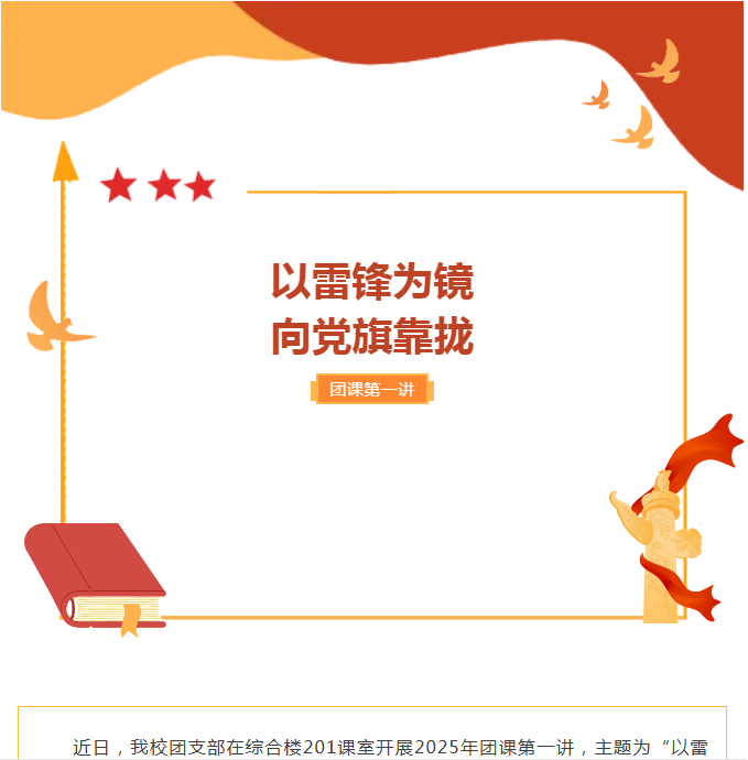 </h1>以雷锋为镜向党旗靠拢团课第一讲近日,我校团支部在综合楼201课室开展2025年团课第一讲,主题为“以雷锋为镜,向党旗靠拢”,团支部书记兼学生处副主任陈银龙担任主讲人。了解雷锋雷锋,原名雷正兴,1940年出生...