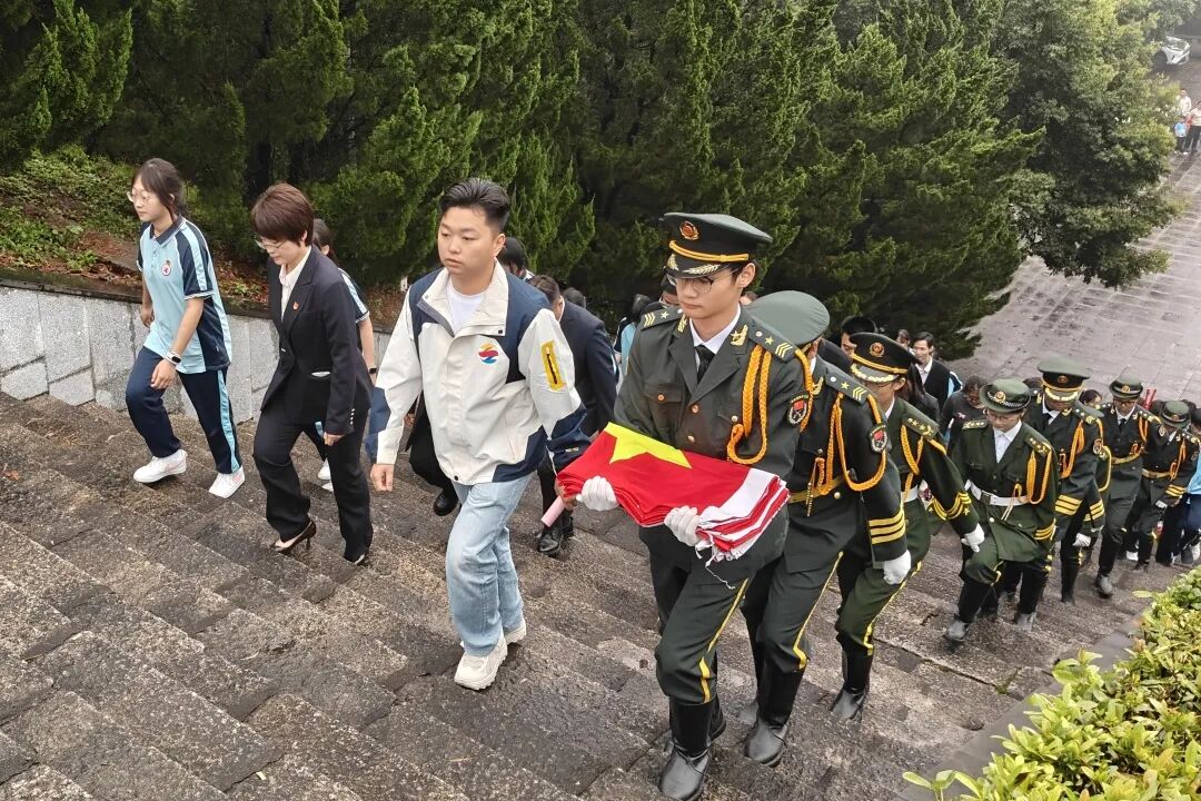 全体师生肃立,奏唱《中华人民共和国国歌》,激昂的旋律回荡在陵园上空,每一个音符都承载着家国情怀,在全体人员心中激荡起强烈的爱国共鸣。